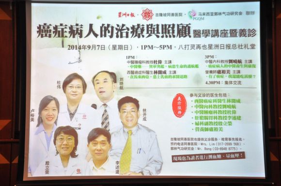 2014年9 月7 日星期日下午1时到5时,星洲日報、吉隆坡同善醫院和馬來西亞郭林氣功研究會聯辦 “癌症病人的治療與照顧” 医学讲座暨地点于星洲日報總社禮堂。