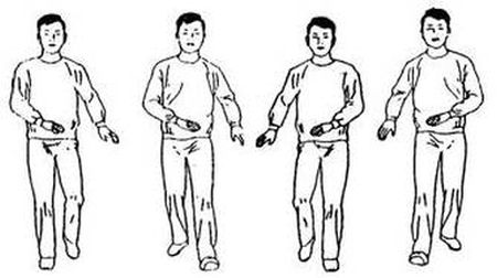 The hands move away from Zhong dantian with palms facing to the ground while swing back with palm face to Zhong dantian (FIG. 1-29) is called "balance" method. This method should be practised by the cancer patients after they have recovered for some time.